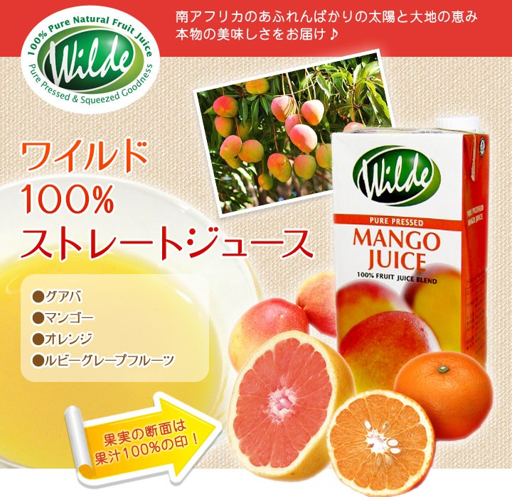 濃縮還元ではない、本物ストレート果汁100%! 同じ果汁100%でも全然違う本物の美味しさ♪ お子様からお年寄りまで、 朝昼晩毎日ゴクゴク。 ご家庭で。オフィスで。スポーツの後で。 まるでフルーツをそのまま食べているみたいな極生果汁♪ フレッシュ満点! ビタミンやミネラルが豊富。 ギュッと搾っただけなので、ジュースの中に残っている食物繊維も一緒に摂れます。 砂糖・保存剤無添加。 果物好きが集う南アフリカだからこそ実現できた本格的な味。 太陽の恵みあふれる南アフリカで、手摘み果実を手で選別。 ワイルド社は南アフリカフルーツジュース協会のメンバーで、 ケープタウンの北東100kmのウェリントンにあります。 工場はGMP/HACCPに対応しています。